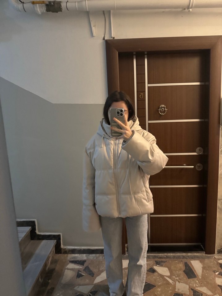 Beyaz renk kapşonlu mont deri dışı kumaş değil hiç bir sorunu yok alalı 3 ay olucak kendime başka aldığım için satıyorum almak isteyenlere özelden detaylı fotoğraf atarım ben elli kilo olmama rağmen xl aldım koldan büyük oluyor biraz onun harici gayet iyi