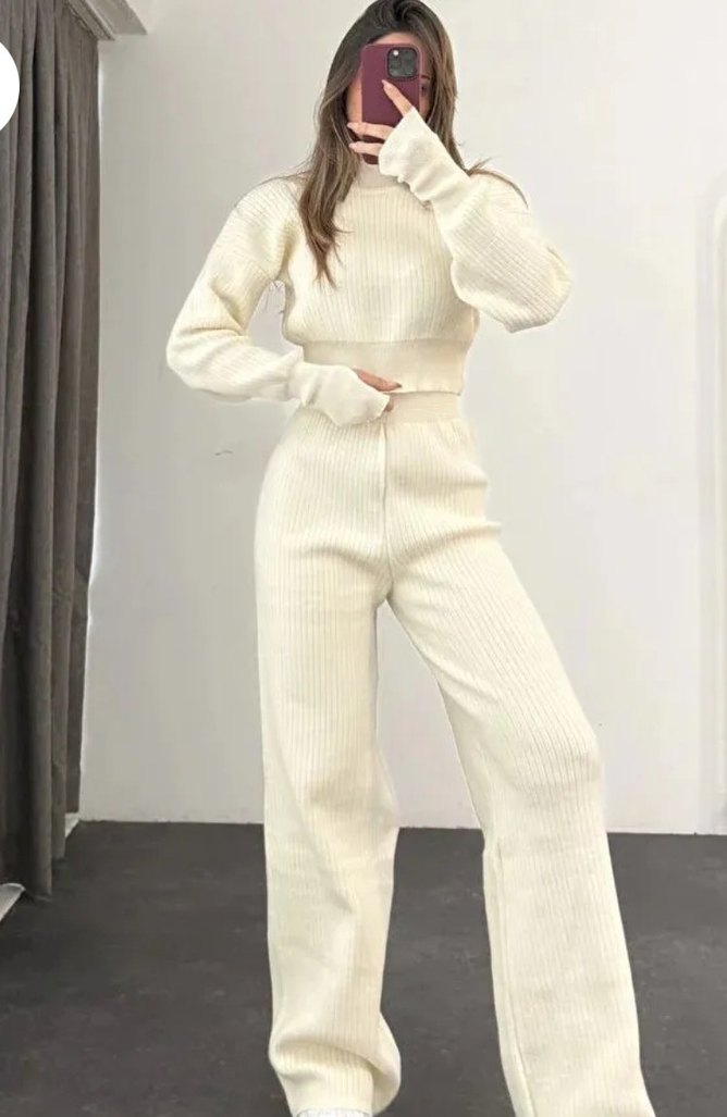 Yüksek yakalı, uzun kollu beyaz triko eşofman takımı, rahat kesimi ve midi boyuyla gündelik kullanıma uygun, şık ve konforlu bir tercih.