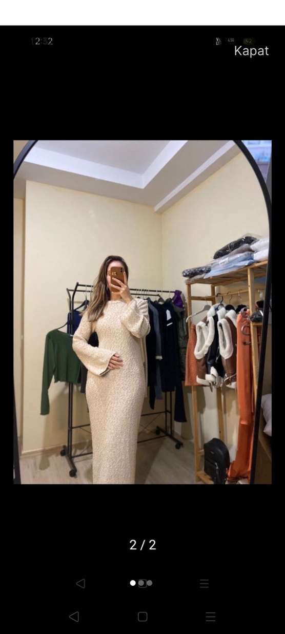 Yüksek yakalı ve uzun kollu, beyaz renkte yumuşak triko kumaştan yapılmış, vücuda oturan uzun elbise. Desensiz, bohem tarzıyla günlük kullanıma uygun rahat ve şık. standart beden