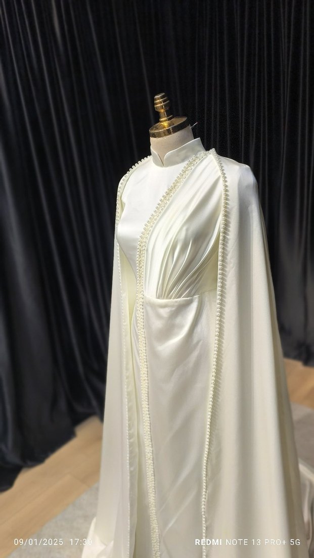 Beyaz, yüksek yakalı, dökümlü kumaştan uzun kadın gelinliği. Parlak ve düz desene, klasik ve avangart tarzda Kolları ve kollarında incileri olan, omuzlardan bağlanan pelerinli, farklı bir gelinlik