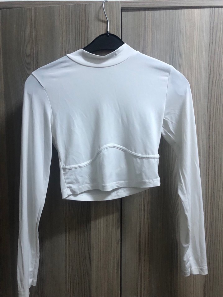 Beyaz, yüksek yakalı ve uzun kollu, vücuda oturan kesime sahip bluz. Düz, sentetik kumaştan, minimal ve günlük kullanıma uygun tarzda.