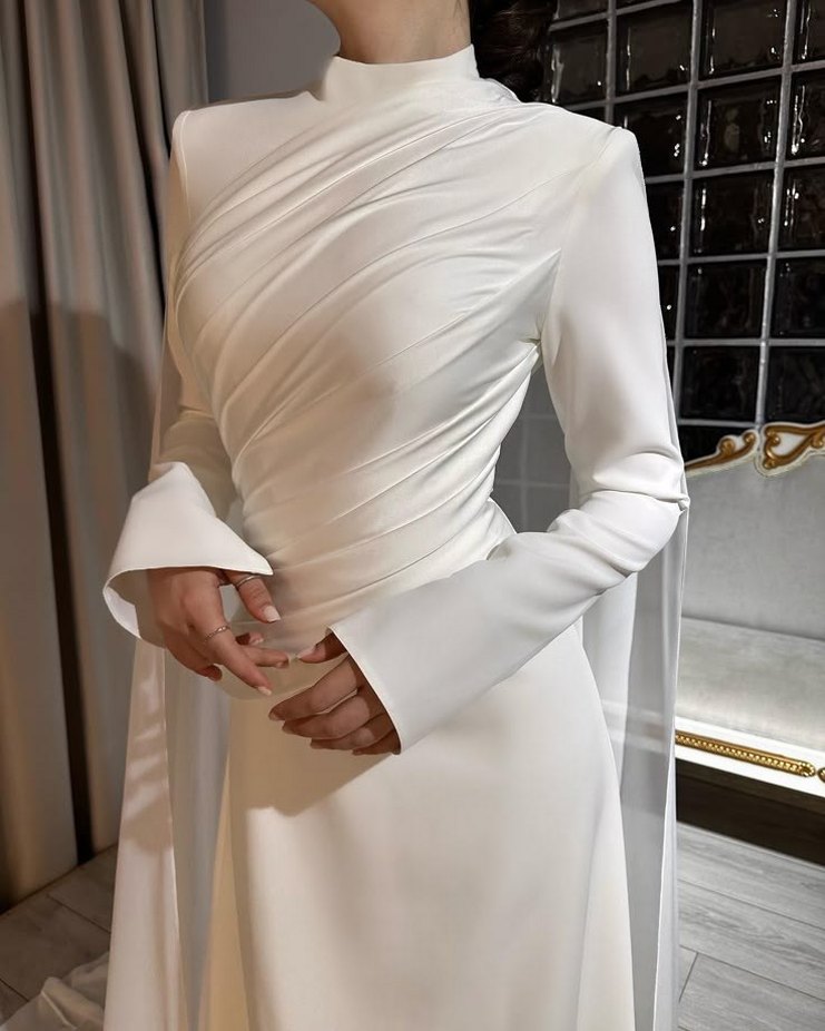 Beyaz renkli, yüksek yakalı ve uzun kollu kadın elbisesi. Drapeli tasarımı, klasik ve avangart tarzı yansıtır. Normal kesim ve uzun boyda, düğünlere uygun şık bir modeldir. kiralik :12500 instagram: seymanurkayastudio satilik:26000