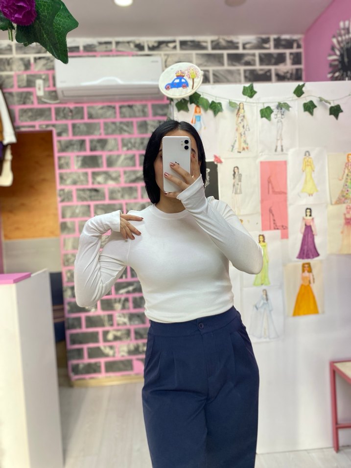 Pamuk kumaştan, beyaz yüksek yakalı ve uzun kollu, vücuda oturan kadın bluz. Midi boy ve desensiz tasarımıyla günlük kullanım için şık ve rahat.