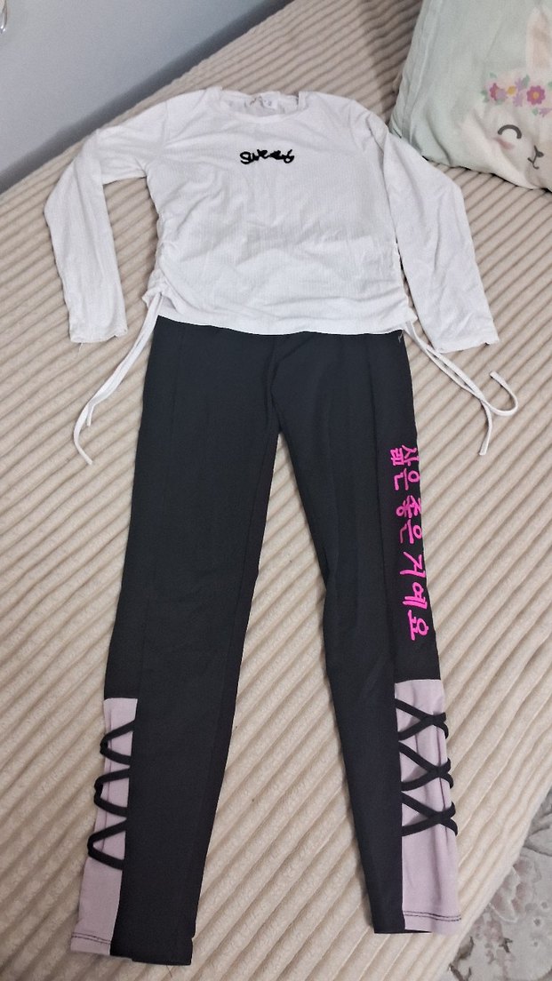 Beyaz, yüksek yakalı uzun kollu üst, yan bağcıklı. , pembe baskılı ve bileklerde bağcıklı detaylı.kı cocuk ıkılı takım 8,9 yasa uyar temıź