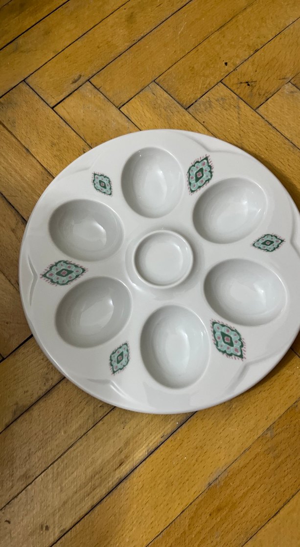 Yedi oval bölmeli beyaz yumurta servis tabağı, sade desenlerle süslenmiştir. Pratik kullanıma uygundur. Hiç kullanılmamıştır