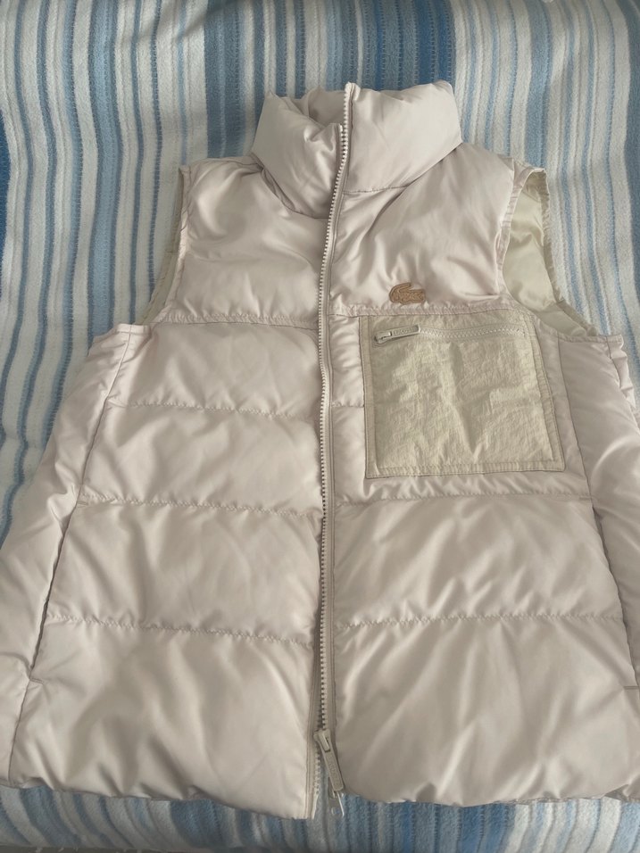 Yüksek yakalı, fermuarlı beyaz yelek. Yumuşak sentetik kumaştan, dar kesim ve ön cep detaylı. Rahat sokak stili için uygun.