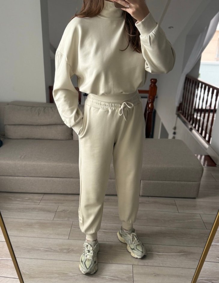 Yüksek yakalı, uzun kollu ve bol kesimli beyaz pastel tonlarda kadın eşofman takımı. Yumuşak ve sıcak kumaştan, konforlu ve şık bir günlük tercih. ♀️