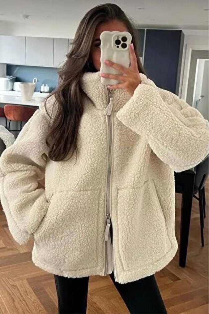 Beyaz, yumuşak kumaştan yapılmış, yüksek yakalı ve kürk detaylı bu ceket, bol kesim ve uzun kollu olup günlük sokak stili için uygundur. Orta uzunluktadır.ilk görsel temsili