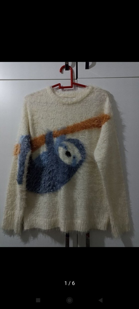 Beyaz renkli, uzun kollu ve yuvarlak yakalı bu örgü kazak, rahat kesimi ve sevimli temalı baskısıyla günlük rahat stil için uygundur.