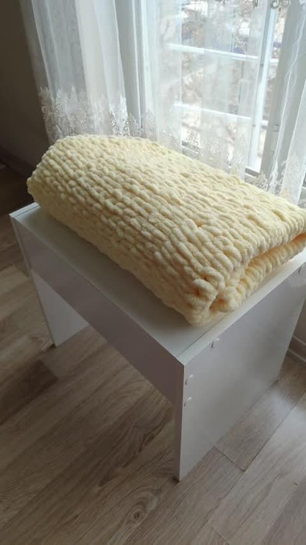Pastel beyaz renkte yumuşak yünden yapılmış, desensiz bebek battaniyesi.
