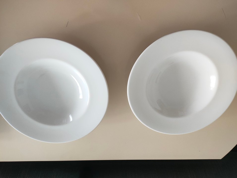 İki adet beyaz, yuvarlak ve pürüzsüz yüzeyli gıda kabı, çeşitli yiyecekleri saklamak için uygundur. birinin arkasında üretim hatası vardır ama sorun teşkil etmemektedir ️