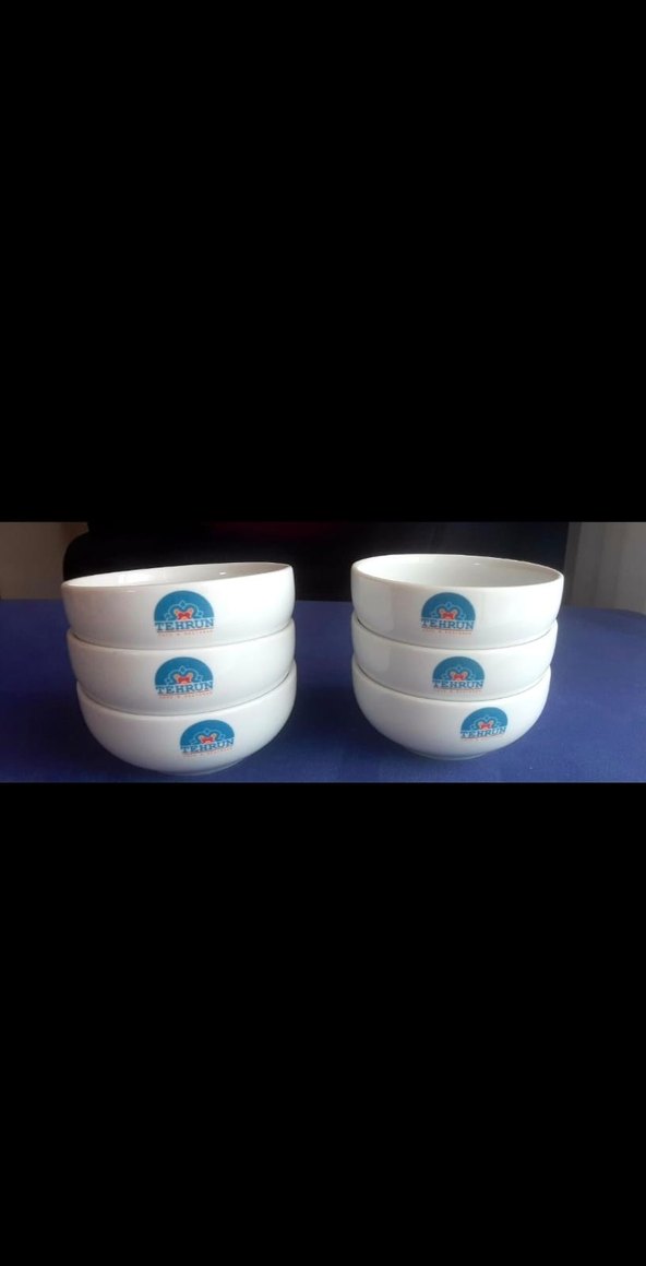 Renkli logolu beyaz yuvarlak yemek kapları, yiyecek sunumu veya saklama için uygundur. Dayanıklı ve kolay temizlenir. ️