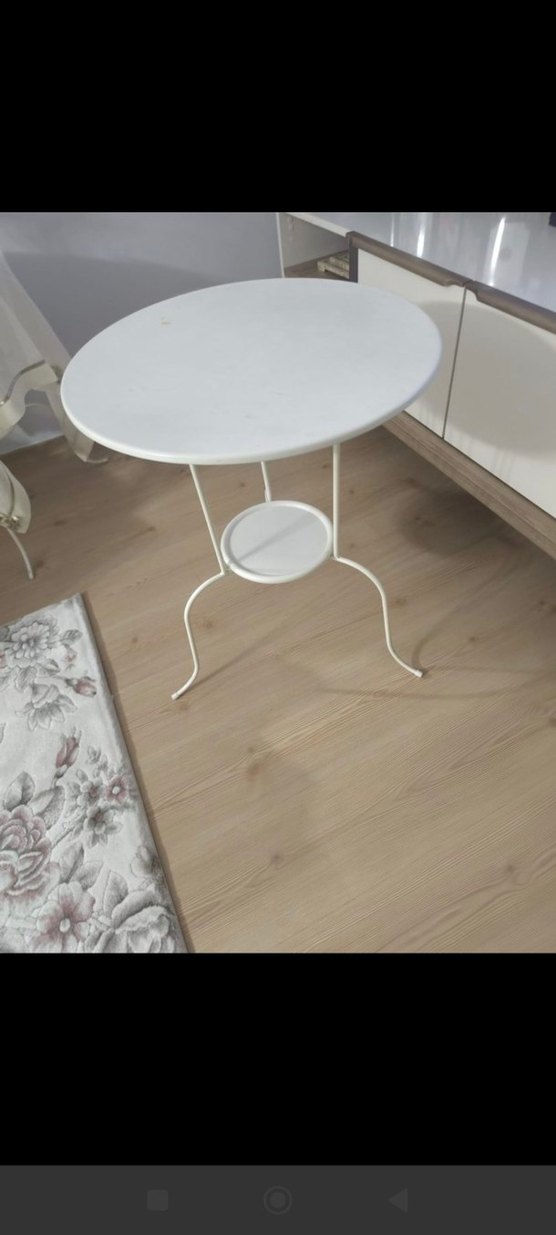 son 2 ad ikea Beyaz yuvarlak sehpa, metal çerçeveli ve küçük alt raflı, iç mekan kullanımı için uygun. metal bir üründür hiçbir sorunu yok