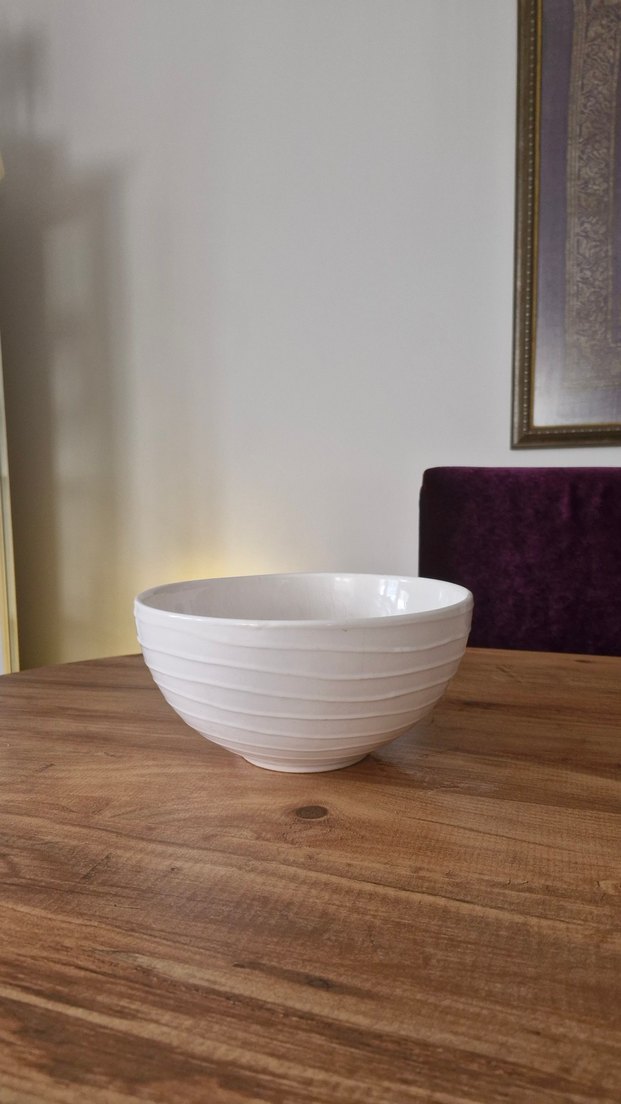 Beyaz seramikten yapılmış, yatay çizgili yuvarlak kase, yiyecek sunumu veya saklama için uygundur.
