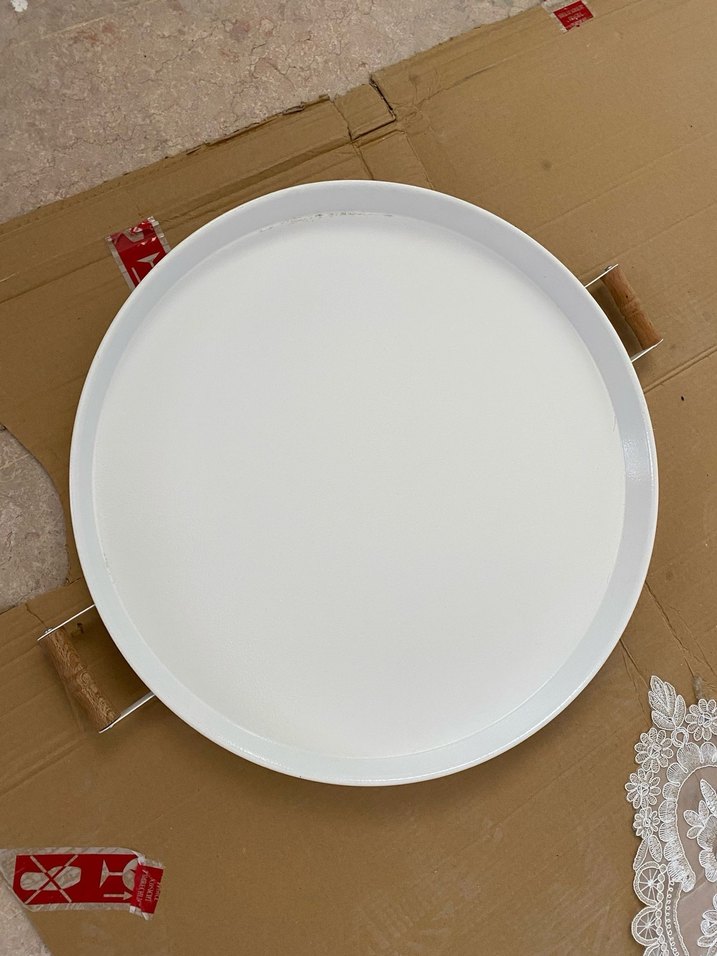 Beyaz, yuvarlak ve düz yüzeyli servis tepsisi, yiyecek ve içecek taşımak için uygundur. Basit ve sade tasarıma sahiptir. ️