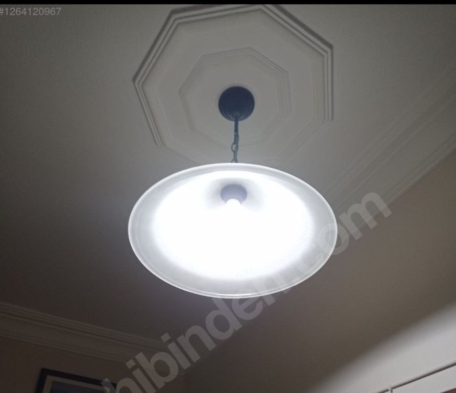 Basit tasarımlı, beyaz yuvarlak tavan lambası, parlak ışık sağlar. Kısa zincirle tavana asılmıştır.