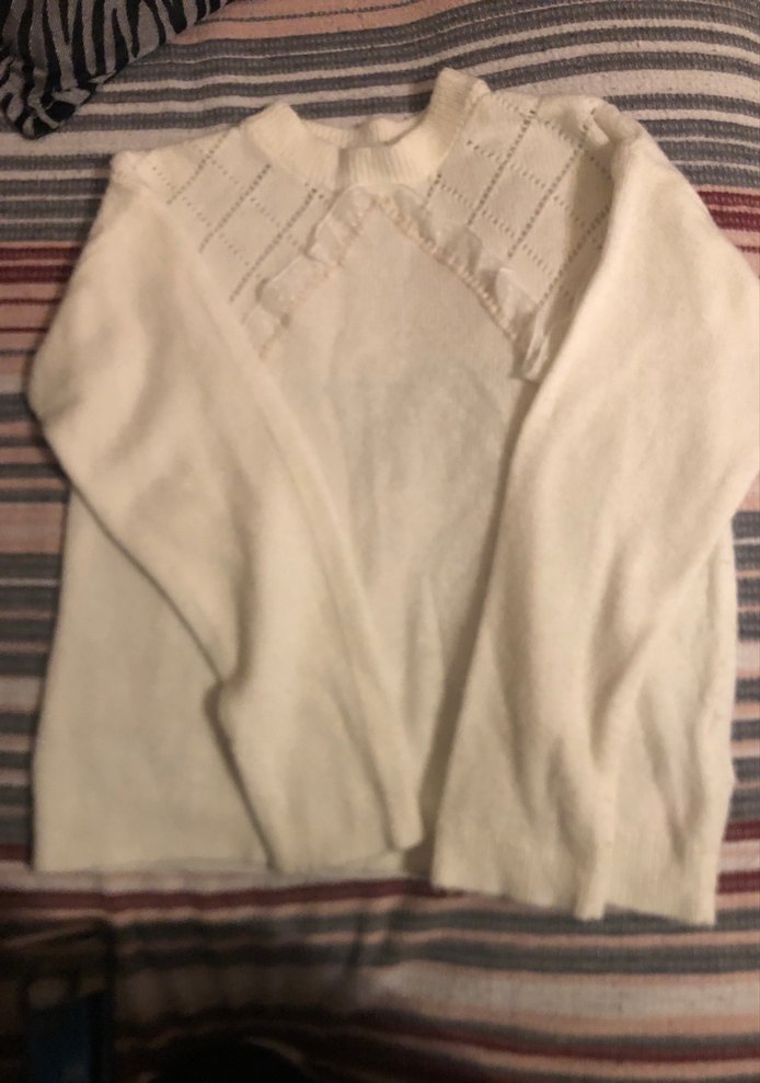 Beyaz renkli, yuvarlak yakalı ve uzun kollu örgü kadın kazak. Rahat ve bol kesim, midi boyda, yumuşak sentetik kumaştan üretilmiştir.