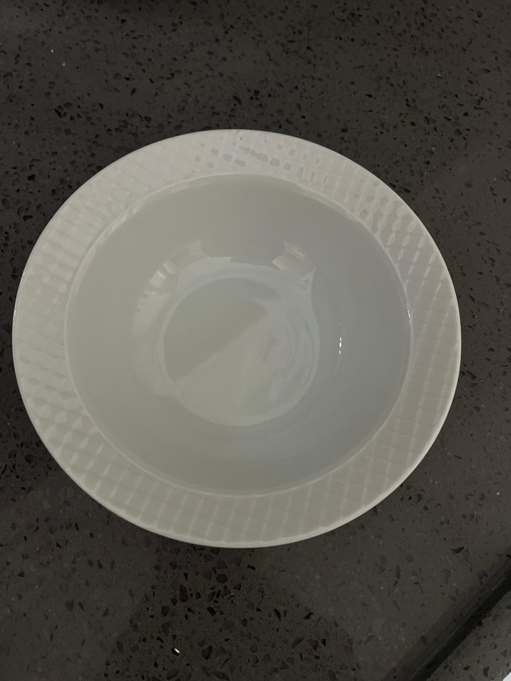 Doku desenli kenarı olan beyaz yuvarlak yemek kabı, çeşitli yemekler için uygundur. ️