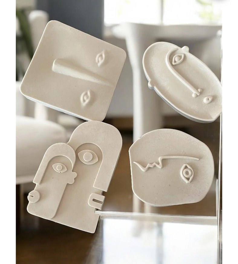 Üzerinde sanatsal yüz desenleri bulunan beyaz şık ve farklı bir görünüm sunar.
