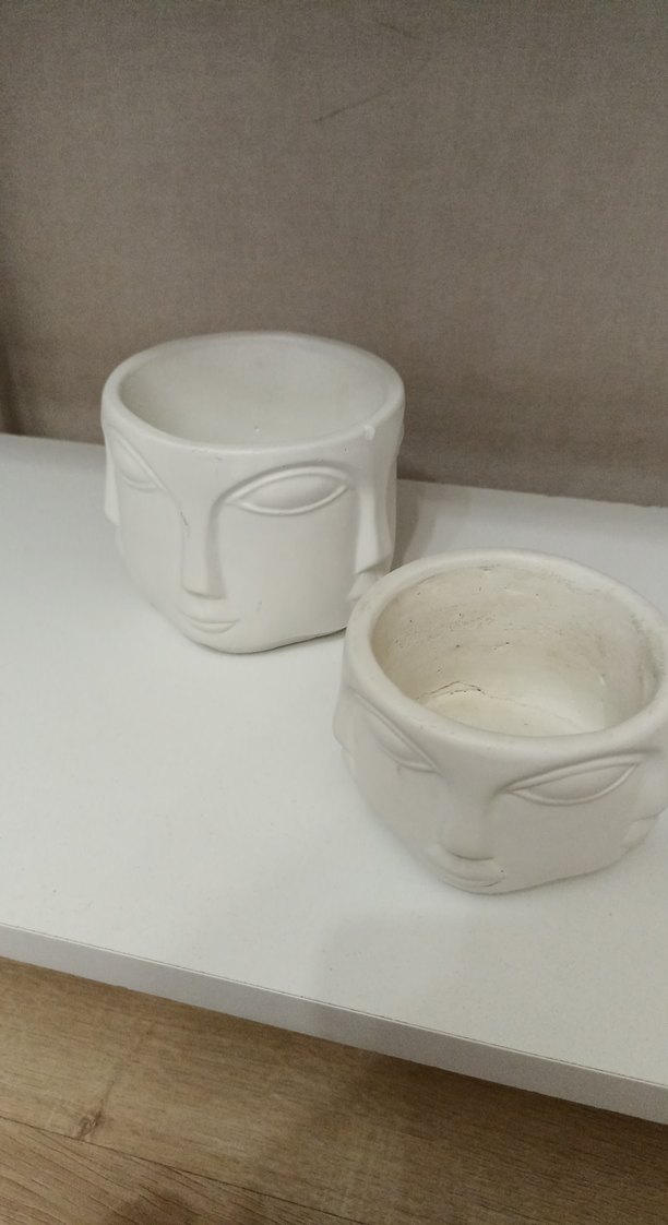 beyaz renklerde, soyut yüz figürü tasarımlı, pürüzsüz yüzeyli dekoratif vazolar,biblo saksı olarak kullanılabilir küçük olanın içine toprak koydugum için grilesti bir sorunu yoktur.