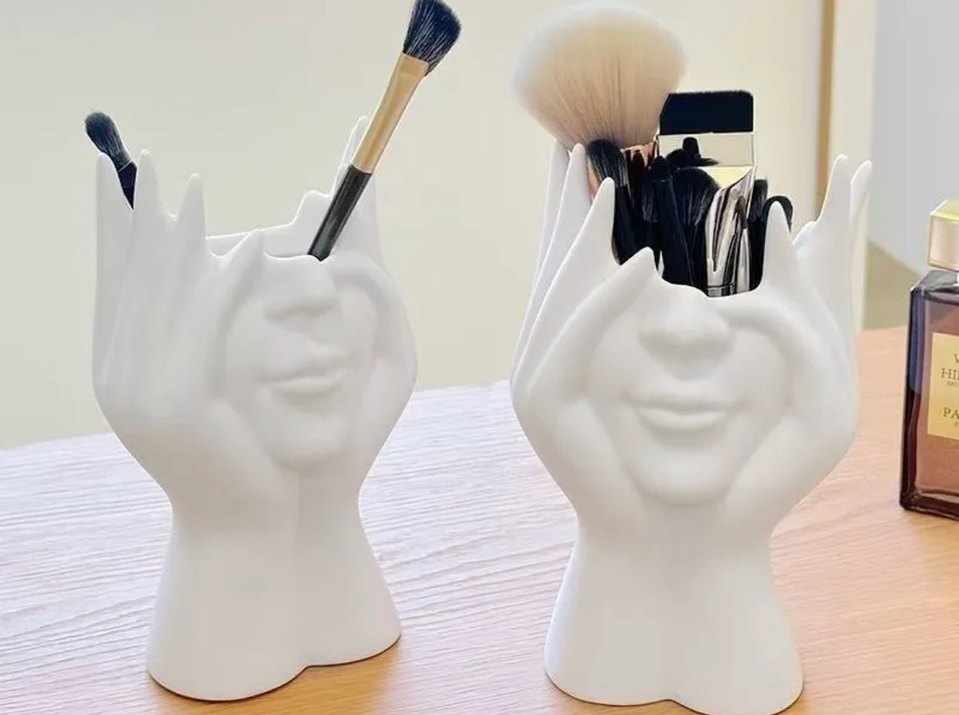 Fırça makyaj ve kalem malzemeleri için yüz şeklinde beyaz renkli organizer. Hafif renk tonu ve modern sanatsal tasarım.