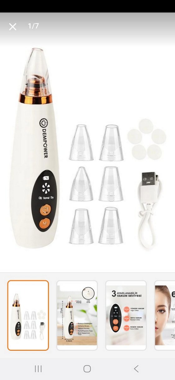 Beyaz yüz temizleme cihazı, altı değiştirilebilir vakum başlığı ve USB şarj kablosu ile çeşitli cilt tiplerine uygun. Yağlı, normal ve kuru cilt için farklı modlar sunar.