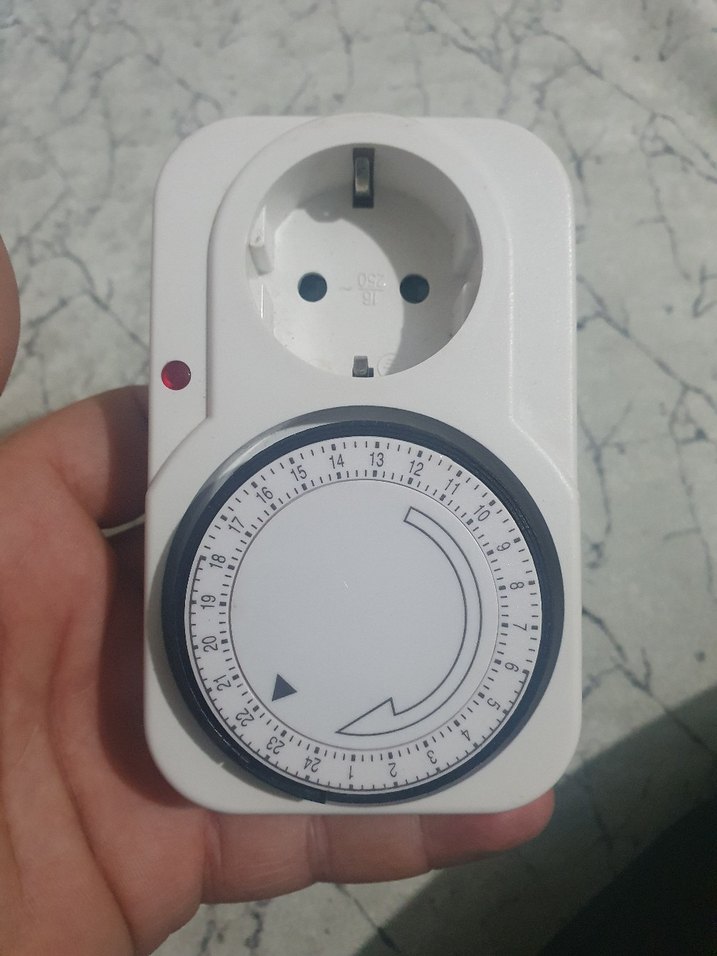 Belirli açma/kapama saatleri ayarlanabilen kadranlı beyaz zaman ayarlı priz. Yuvarlak priz ve küçük gösterge ışığı bulunur. ⏰