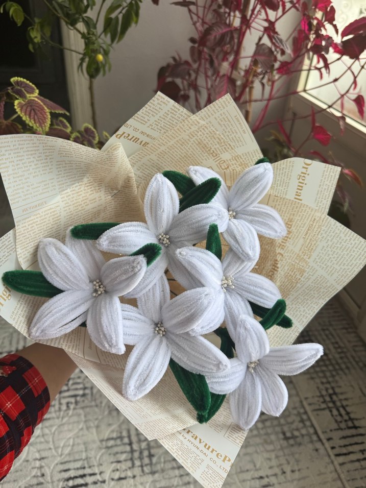 İşlemeli yapraklara ve boncuk detaylara sahip beyaz zambak buket