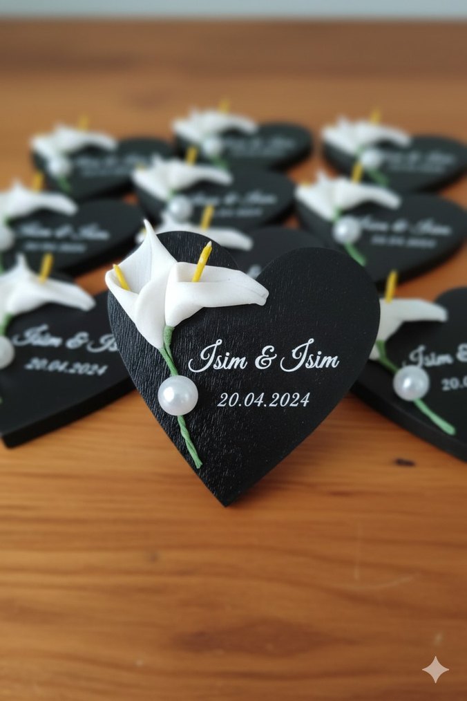 İsim ve tarih yazılı, beyaz zambak süslemeli siyah kalp nikah hediyesi. İnci detayıyla şık bir görünüm sunar. ️