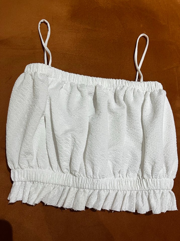 Zara beyaz askılı ve fırfırlı detaylara sahip, bol kesim midi uzunluğunda günlük kullanıma uygun büstiyer. Minimalist ve bohem tarzda. Kısursuz