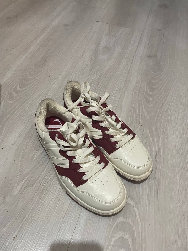 Beyaz, bağcıklı, düz tabanlı kadın spor ayakkabısı. Kauçuk tabanlı, hafif tasarıma sahip, spor ve günlük sokak giyimine uygun. 1 kere giydim