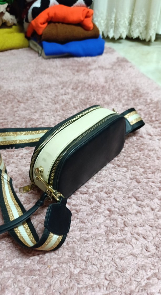 Zebra desenli beyaz deri çapraz çanta, fermuarlı bölmelere sahip. Altın detaylı pastel renkli askısı ile trend sokak stiline uygun.