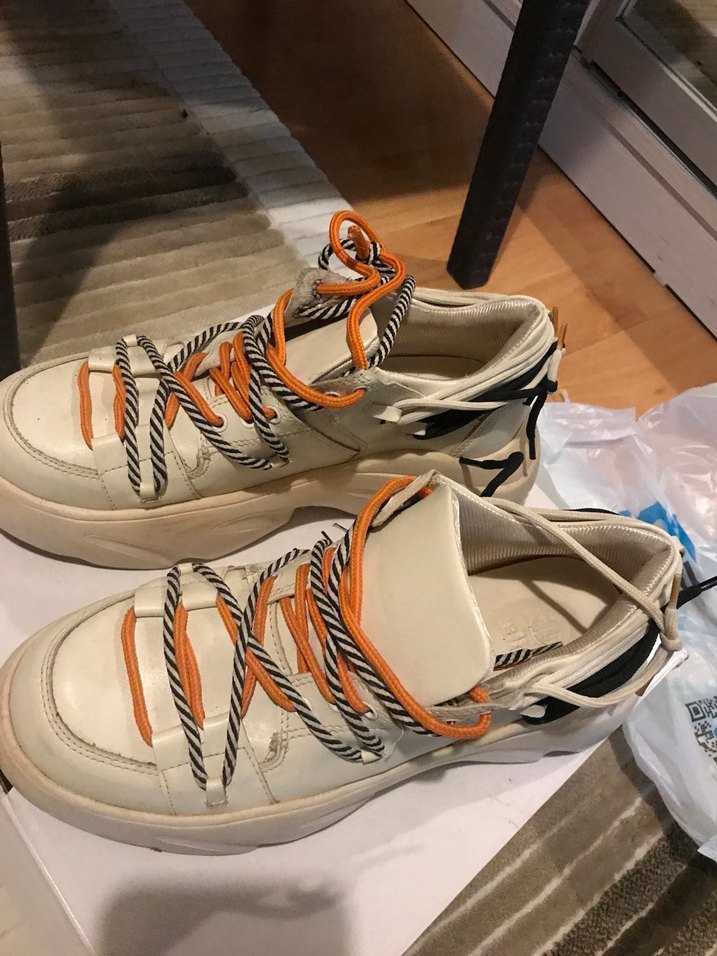 Beyaz zebra desenli ve turuncu detaylı bağcıkları olan, dolgu topuklu kadın spor ayakkabısı, kauçuk tabanlı ve günlük kullanım için uygundur. ♀️
