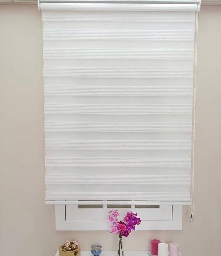 Beyaz zebra desenli stor perde, modern tasarımı ve ayarlanabilir ışık kontrolü ile dikkat çekiyor. Renkleri mevcuttur kişiye özel