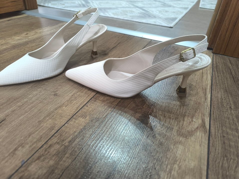 Beyaz zebra desenli, pileli ve ince topuklu kadın ayakkabısı. Sentetik kumaştan yapılmış, düğün için uygundur. bir defa giydim. dgn den aldım. yepyeni.