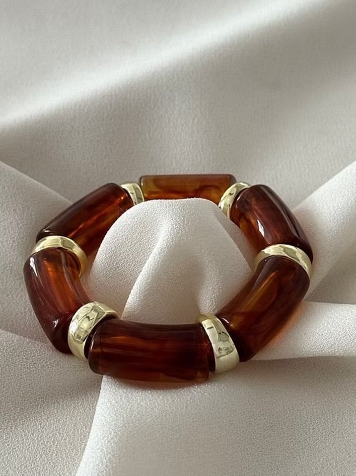 Parlak detaylar ve yılan desenine sahip kahverengi boncuklu bileklik, günlük kullanıma uygun vintage bohem tarzını yansıtıyor.