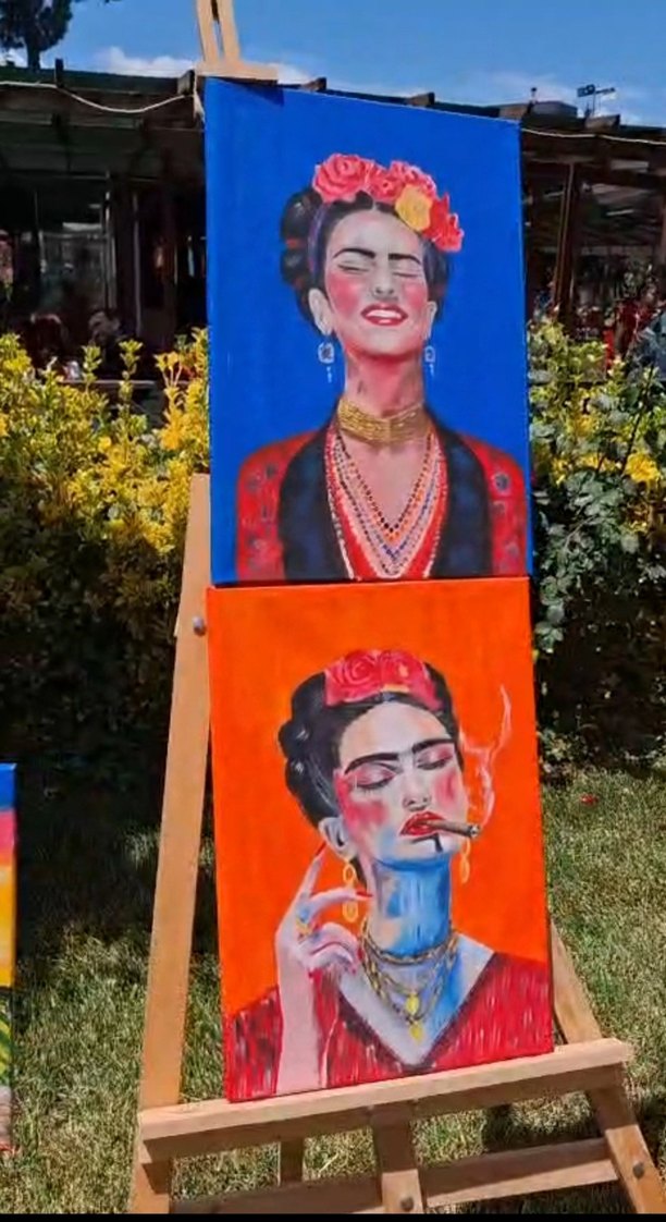Dış mekanda sergilenen iki tablo, biri beyaz zemin üzerinde sıcak tonlarda soyut çiçek desenleri, diğeri karlı ormanda peri figürü içeriyor.