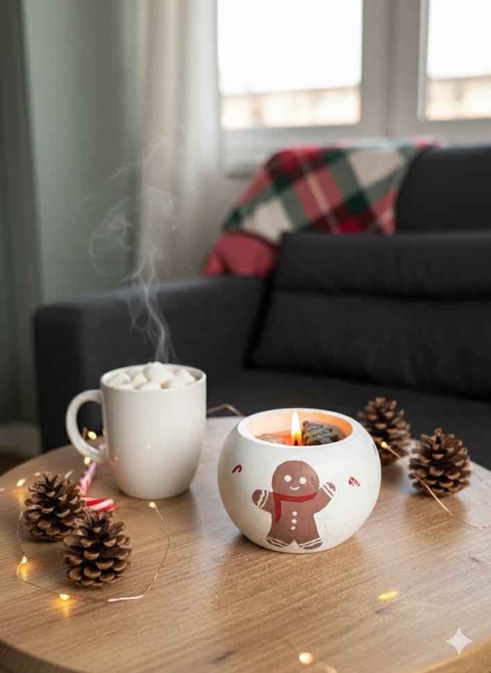 İçinde yanan mum bulunan, zencefilli kurabiye desenli beyaz bir mumluk. Ortama sıcak bir hava katar. ️