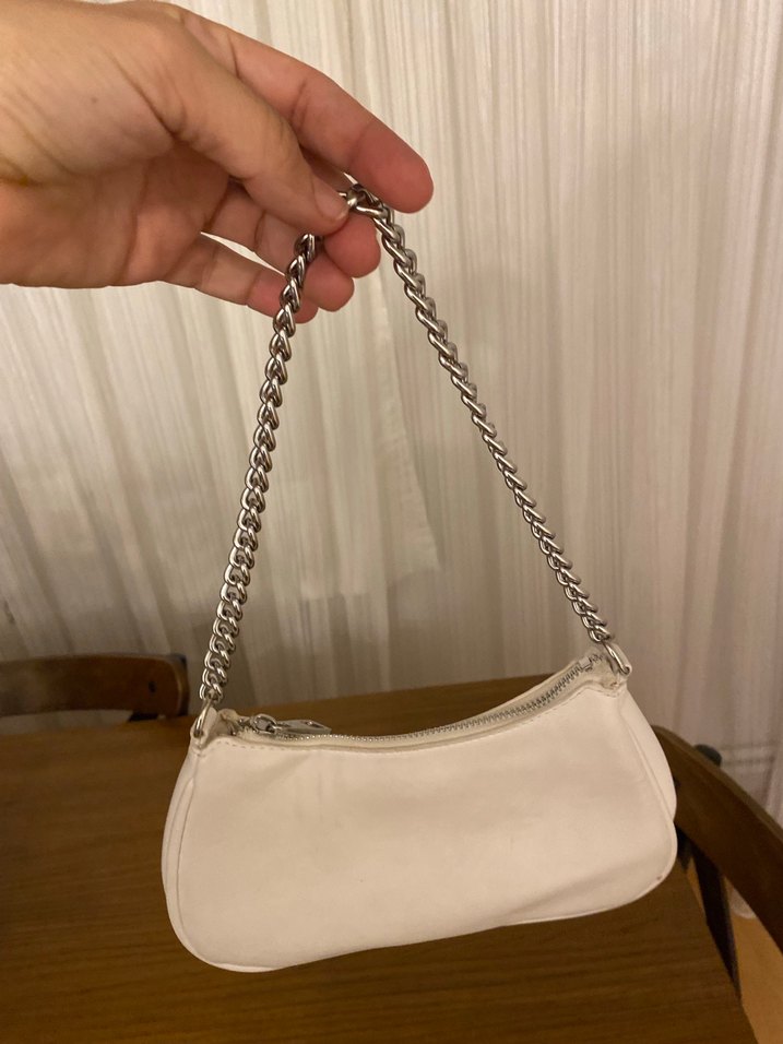 Beyaz renkli deri kadın çanta, zincir detaylı askısı ile dikkat çeker. Pastel tonları ve desensiz yapısıyla günlük sokak stiline uygundur.