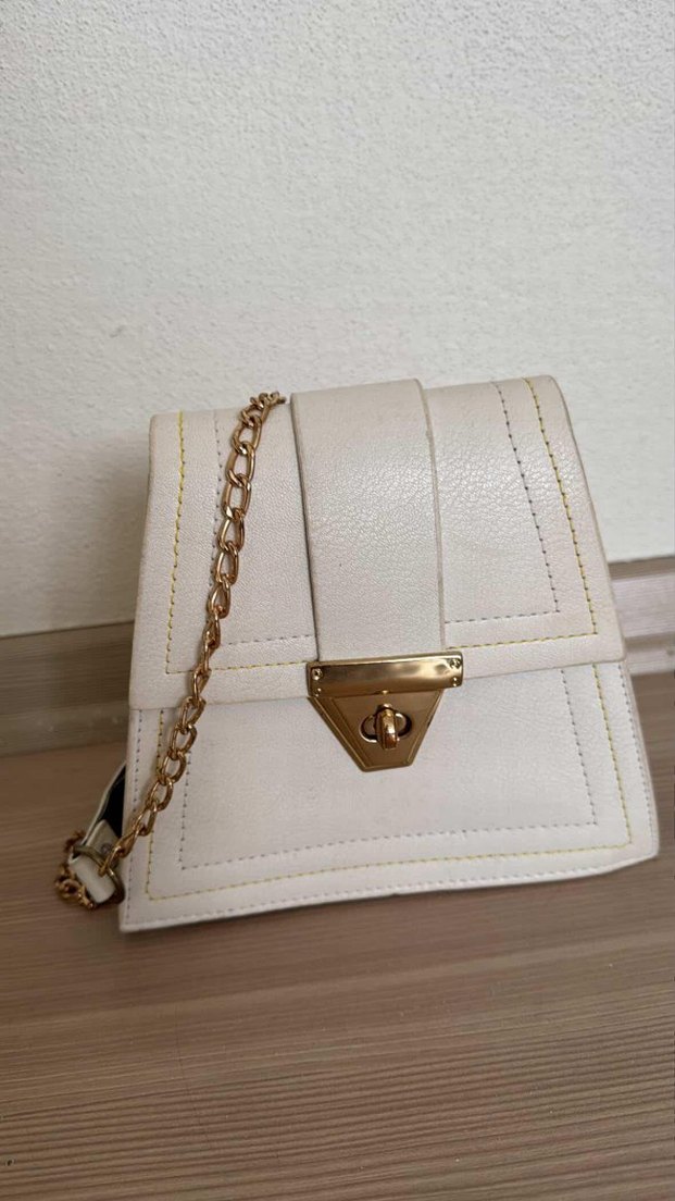 Beyaz deri çanta, yılan desenli ve zincir detaylıdır. Modern klasik tarzda, Parisli şıklığını yansıtır.