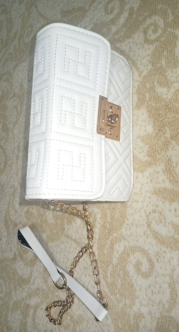 Beyaz deri çanta, işleme desenleri ve zincir detayına sahip, klasik zarafeti modern tarzla buluşturuyor.