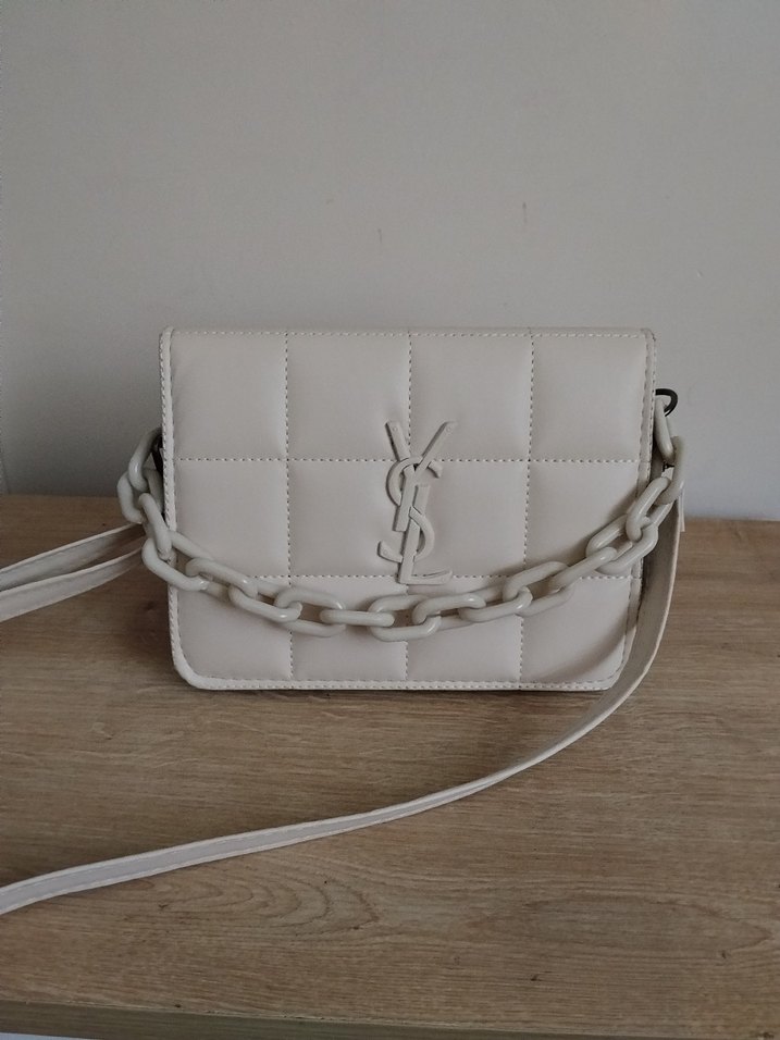Zincir detaylı beyaz deri kadın çantası, baskılı kapitone desene sahip. Günlük sokak stiline uygun, rahat kullanımlık.