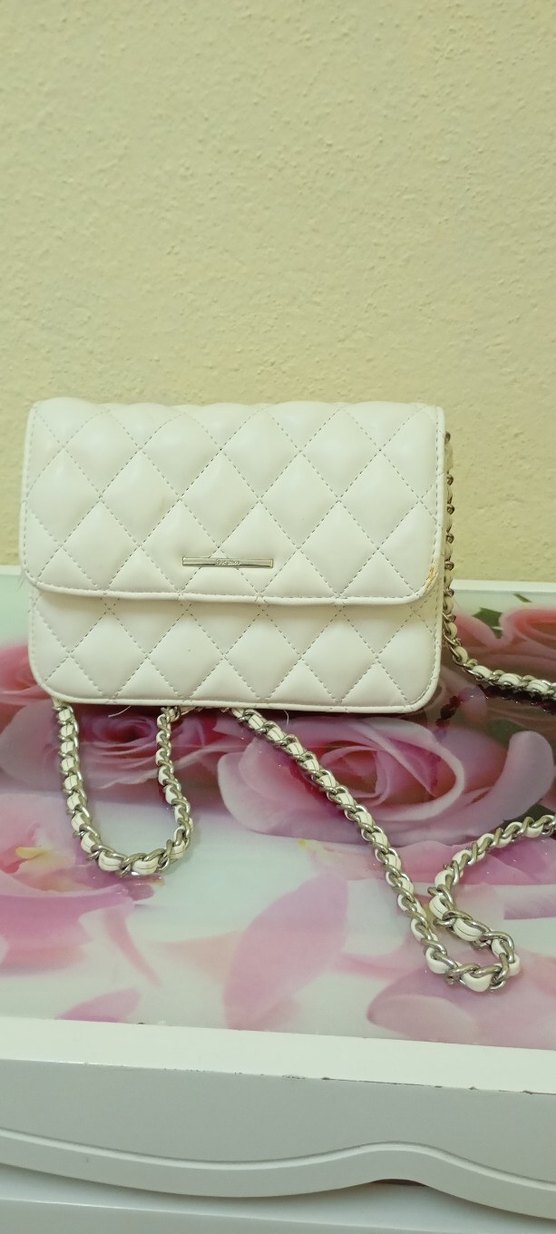 Zincir detaylı beyaz deri kadın çantası, modern klasik tarzda ve desen içermeyen pastel renktedir. Günlük kullanım için uygundur.