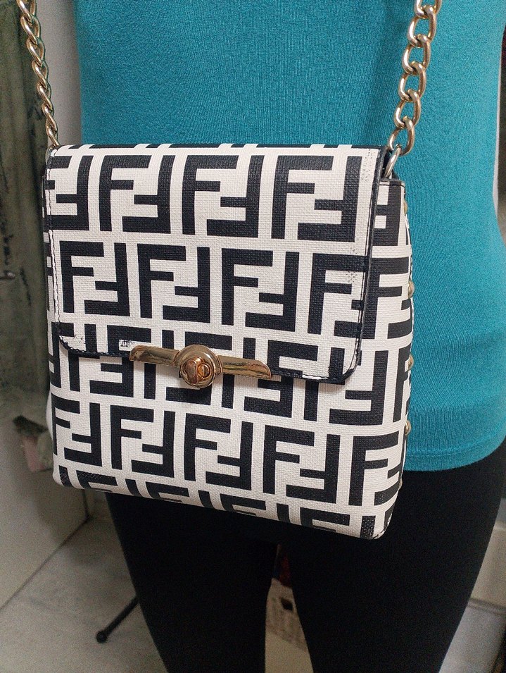 Beyaz, zincir detaylı ve desenli kadın çantası, sentetik kumaştan üretilmiştir. Günlük kullanım için uygun, trend sokak stili ile uyumludur.