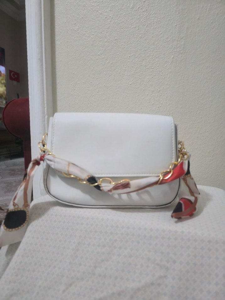 Sentetik kumaştan yapılmış, zincir detaylı ve yılan desenli fularlı beyaz kadın çantası, rahat sokak stili için uygun.