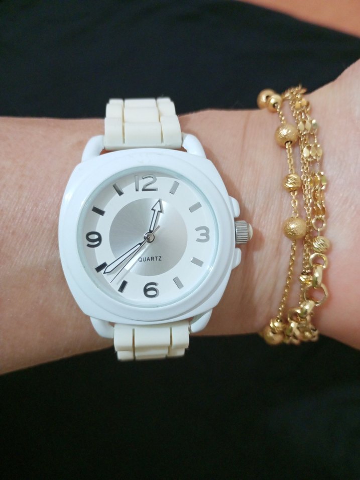 Beyaz renkli, zincir detaylı kayışa sahip kadın saati. Minimalist tasarımı ve renkli detaylarıyla dikkat çeker. Kadranda 6 rakamı belirgindir. ⌚pili yok