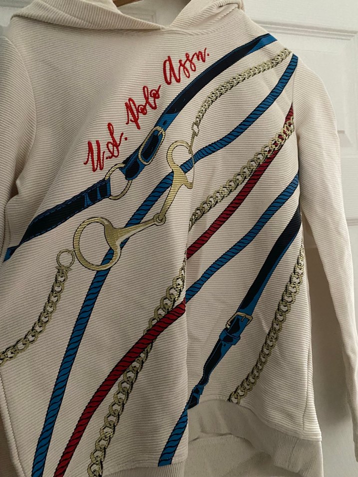 Beyaz renkli, zincir detaylı baskılı Kadın sweatshirt, halter yaka ve bol kesim ile sokak tarzına uygun.