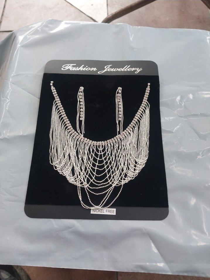 Parlak beyaz zincir detaylı, baskılı, gösterişli bohem tarzda kadın takı seti. Küpe ve kolye içerir, nikel içermez. ✨