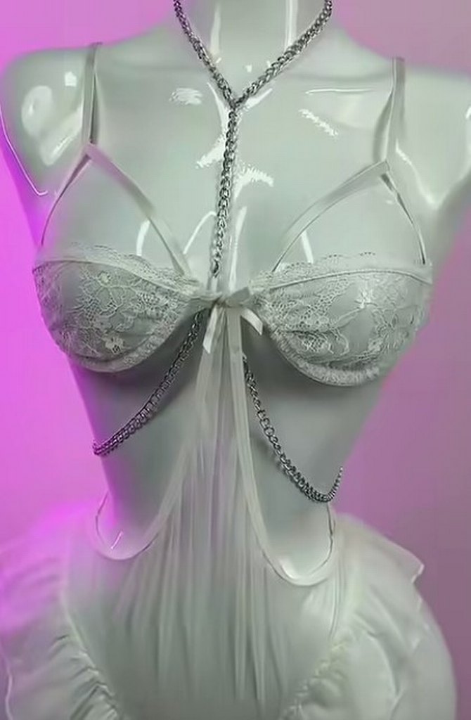 Beyaz renkte, zincir detaylı bu kadın vücut zinciri cesur goth tarzını gösterir ve düğünler için uygundur. Hafif ve desensiz bir görünüme sahiptir.