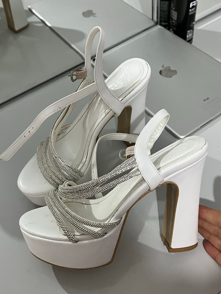 Beyaz platform topuklu, parlak yılan deseni ve zincir detaylı, kauçuk malzemeden yapılmış. Düğünler için klasik zarafet ve modern tarzı birleştirir. Sadece düğünümde giydim